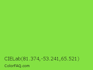 CIELab 81.374,-53.241,65.521 Color is a normal green color and the nearest color is Kiwi #8ee53f. Hex code #84e142 and RGB value is rgb(132,225,66). In RGB color space, this color is composed of 52% red, 88% green, 26% blue, In CMYK color space, this color is composed of 41% cyan, 0% magenta, 71% yellow , 12% black , In HSL color space, this color has a hue angle of 95° , 73% saturation and 57% lightness.