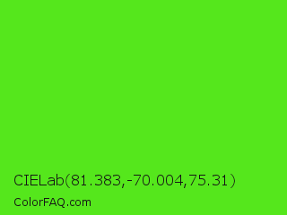 CIELab 81.383,-70.004,75.31 Color is a normal green color and the nearest color is Harlequin Green #46cb18. Hex code #55e71c and RGB value is rgb(85,231,28). In RGB color space, this color is composed of 33% red, 91% green, 11% blue, In CMYK color space, this color is composed of 63% cyan, 0% magenta, 88% yellow , 9% black , In HSL color space, this color has a hue angle of 103° , 81% saturation and 51% lightness.