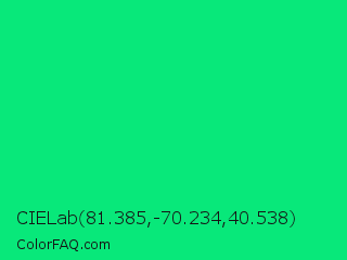 CIELab 81.385,-70.234,40.538 Color is a normal green color and the nearest color is Spring Green #00ff7f. Hex code #08e87a and RGB value is rgb(8,232,122). In RGB color space, this color is composed of 3% red, 91% green, 48% blue, In CMYK color space, this color is composed of 97% cyan, 0% magenta, 47% yellow , 9% black , In HSL color space, this color has a hue angle of 151° , 93% saturation and 47% lightness.