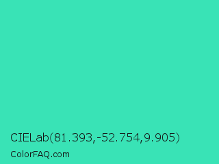 CIELab 81.393,-52.754,9.905 Color is a normal cyan color and the nearest color is Eucalyptus #44d7a8. Hex code #39e3b6 and RGB value is rgb(57,227,182). In RGB color space, this color is composed of 22% red, 89% green, 71% blue, In CMYK color space, this color is composed of 75% cyan, 0% magenta, 20% yellow , 11% black , In HSL color space, this color has a hue angle of 164° , 75% saturation and 56% lightness.