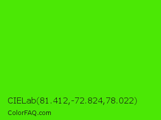 CIELab 81.412,-72.824,78.022 Color is a normal green color and the nearest color is Chlorophyll Green #4aff00. Hex code #4be805 and RGB value is rgb(75,232,5). In RGB color space, this color is composed of 29% red, 91% green, 2% blue, In CMYK color space, this color is composed of 68% cyan, 0% magenta, 98% yellow , 9% black , In HSL color space, this color has a hue angle of 101° , 96% saturation and 46% lightness.