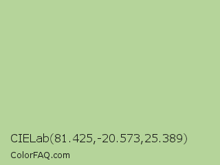 CIELab 81.425,-20.573,25.389 Color is a light green color and the nearest color is Granny Smith Apple #a8e4a0. Hex code #b5d49a and RGB value is rgb(181,212,154). In RGB color space, this color is composed of 71% red, 83% green, 60% blue, In CMYK color space, this color is composed of 15% cyan, 0% magenta, 27% yellow , 17% black , In HSL color space, this color has a hue angle of 92° , 40% saturation and 72% lightness.