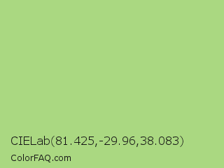 CIELab 81.425,-29.96,38.083 Color is a light green color and the nearest color is Feijoa #9fdd8c. Hex code #aad881 and RGB value is rgb(170,216,129). In RGB color space, this color is composed of 67% red, 85% green, 51% blue, In CMYK color space, this color is composed of 21% cyan, 0% magenta, 40% yellow , 15% black , In HSL color space, this color has a hue angle of 92° , 53% saturation and 68% lightness.