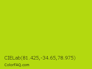 CIELab 81.425,-34.65,78.975 Color is a normal lime color and the nearest color is Inch Worm #b0e313. Hex code #b3d90f and RGB value is rgb(179,217,15). In RGB color space, this color is composed of 70% red, 85% green, 6% blue, In CMYK color space, this color is composed of 18% cyan, 0% magenta, 93% yellow , 15% black , In HSL color space, this color has a hue angle of 71° , 87% saturation and 45% lightness.