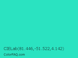 CIELab 81.446,-51.522,4.142 Color is a normal cyan color and the nearest color is Turquoise PWG #30d5c8. Hex code #2ae3c1 and RGB value is rgb(42,227,193). In RGB color space, this color is composed of 16% red, 89% green, 76% blue, In CMYK color space, this color is composed of 81% cyan, 0% magenta, 15% yellow , 11% black , In HSL color space, this color has a hue angle of 169° , 77% saturation and 53% lightness.