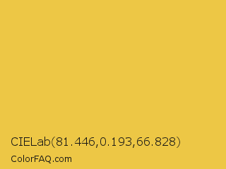 CIELab 81.446,0.193,66.828 Color is a normal yellow color and the nearest color is Ronchi #ecc54e. Hex code #edc745 and RGB value is rgb(237,199,69). In RGB color space, this color is composed of 93% red, 78% green, 27% blue, In CMYK color space, this color is composed of 0% cyan, 16% magenta, 71% yellow , 7% black , In HSL color space, this color has a hue angle of 46° , 82% saturation and 60% lightness.