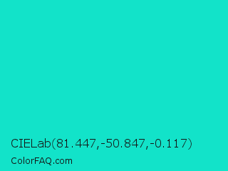 CIELab 81.447,-50.847,-0.117 Color is a normal cyan color and the nearest color is Bright Turquoise #08e8de. Hex code #12e3c9 and RGB value is rgb(18,227,201). In RGB color space, this color is composed of 7% red, 89% green, 79% blue, In CMYK color space, this color is composed of 92% cyan, 0% magenta, 11% yellow , 11% black , In HSL color space, this color has a hue angle of 173° , 85% saturation and 48% lightness.