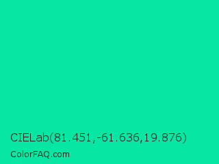 CIELab 81.451,-61.636,19.876 Color is a normal green color and the nearest color is Medium Spring Green #00fa9a. Hex code #08e6a3 and RGB value is rgb(8,230,163). In RGB color space, this color is composed of 3% red, 90% green, 64% blue, In CMYK color space, this color is composed of 97% cyan, 0% magenta, 29% yellow , 10% black , In HSL color space, this color has a hue angle of 162° , 93% saturation and 47% lightness.