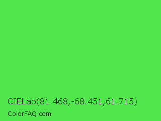 CIELab 81.468,-68.451,61.715 Color is a normal green color and the nearest color is Screamin Green #66ff66. Hex code #4fe74b and RGB value is rgb(79,231,75). In RGB color space, this color is composed of 31% red, 91% green, 29% blue, In CMYK color space, this color is composed of 66% cyan, 0% magenta, 68% yellow , 9% black , In HSL color space, this color has a hue angle of 118° , 76% saturation and 60% lightness.