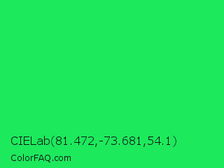 CIELab 81.472,-73.681,54.1 Color is a normal green color and the nearest color is Malachite #0bda51. Hex code #1de95d and RGB value is rgb(29,233,93). In RGB color space, this color is composed of 11% red, 91% green, 36% blue, In CMYK color space, this color is composed of 88% cyan, 0% magenta, 60% yellow , 9% black , In HSL color space, this color has a hue angle of 139° , 82% saturation and 51% lightness.