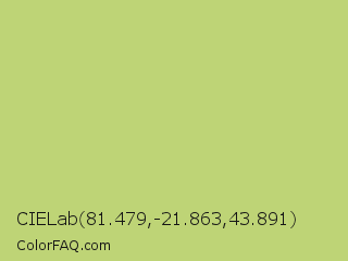 CIELab 81.479,-21.863,43.891 Color is a light lime color and the nearest color is Yellow Green #c5e17a. Hex code #bed476 and RGB value is rgb(190,212,118). In RGB color space, this color is composed of 75% red, 83% green, 46% blue, In CMYK color space, this color is composed of 10% cyan, 0% magenta, 44% yellow , 17% black , In HSL color space, this color has a hue angle of 74° , 52% saturation and 65% lightness.
