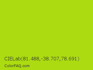 CIELab 81.488,-38.707,78.691 Color is a normal lime color and the nearest color is Inch Worm #b0e313. Hex code #abdb10 and RGB value is rgb(171,219,16). In RGB color space, this color is composed of 67% red, 86% green, 6% blue, In CMYK color space, this color is composed of 22% cyan, 0% magenta, 93% yellow , 14% black , In HSL color space, this color has a hue angle of 74° , 86% saturation and 46% lightness.