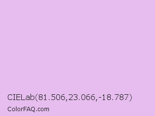 CIELab 81.506,23.066,-18.787 Color is a very light purple color and the nearest color is French Lilac #ecc7ee. Hex code #e6bdee and RGB value is rgb(230,189,238). In RGB color space, this color is composed of 90% red, 74% green, 93% blue, In CMYK color space, this color is composed of 3% cyan, 21% magenta, 0% yellow , 7% black , In HSL color space, this color has a hue angle of 290° , 59% saturation and 84% lightness.