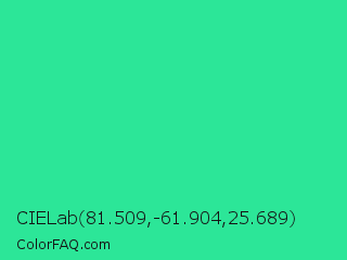 CIELab 81.509,-61.904,25.689 Color is a normal green color and the nearest color is Shamrock #33cc99. Hex code #2ce698 and RGB value is rgb(44,230,152). In RGB color space, this color is composed of 17% red, 90% green, 60% blue, In CMYK color space, this color is composed of 81% cyan, 0% magenta, 34% yellow , 10% black , In HSL color space, this color has a hue angle of 155° , 79% saturation and 54% lightness.