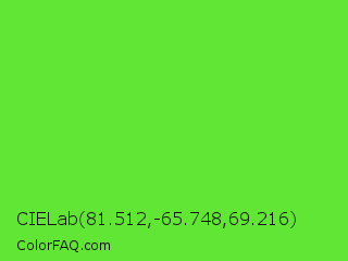 CIELab 81.512,-65.748,69.216 Color is a normal green color and the nearest color is Kiwi #8ee53f. Hex code #61e636 and RGB value is rgb(97,230,54). In RGB color space, this color is composed of 38% red, 90% green, 21% blue, In CMYK color space, this color is composed of 58% cyan, 0% magenta, 77% yellow , 10% black , In HSL color space, this color has a hue angle of 105° , 78% saturation and 56% lightness.