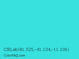CIELab 81.525,-41.134,-11.106 Color is a normal cyan color and the nearest color is Turquoise #40e0d0. Hex code #38e0de and RGB value is rgb(56,224,222). In RGB color space, this color is composed of 22% red, 88% green, 87% blue, In CMYK color space, this color is composed of 75% cyan, 0% magenta, 1% yellow , 12% black , In HSL color space, this color has a hue angle of 179° , 73% saturation and 55% lightness.