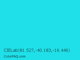 CIELab 81.527,-40.183,-16.446 Color is a normal cyan color and the nearest color is Bright Turquoise #08e8de. Hex code #1fe0e8 and RGB value is rgb(31,224,232). In RGB color space, this color is composed of 12% red, 88% green, 91% blue, In CMYK color space, this color is composed of 87% cyan, 3% magenta, 0% yellow , 9% black , In HSL color space, this color has a hue angle of 182° , 81% saturation and 52% lightness.