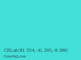 CIELab 81.554,-41.395,-8.388 Color is a normal cyan color and the nearest color is Turquoise #40e0d0. Hex code #42e0d9 and RGB value is rgb(66,224,217). In RGB color space, this color is composed of 26% red, 88% green, 85% blue, In CMYK color space, this color is composed of 71% cyan, 0% magenta, 3% yellow , 12% black , In HSL color space, this color has a hue angle of 177° , 72% saturation and 57% lightness.
