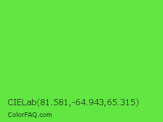 CIELab 81.581,-64.943,65.315 Color is a normal green color and the nearest color is Screamin Green #66ff66. Hex code #61e642 and RGB value is rgb(97,230,66). In RGB color space, this color is composed of 38% red, 90% green, 26% blue, In CMYK color space, this color is composed of 58% cyan, 0% magenta, 71% yellow , 10% black , In HSL color space, this color has a hue angle of 109° , 77% saturation and 58% lightness.