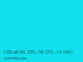 CIELab 81.595,-39.255,-19.006 Color is a normal cyan color and the nearest color is Bright Turquoise #08e8de. Hex code #12e0ed and RGB value is rgb(18,224,237). In RGB color space, this color is composed of 7% red, 88% green, 93% blue, In CMYK color space, this color is composed of 92% cyan, 5% magenta, 0% yellow , 7% black , In HSL color space, this color has a hue angle of 184° , 86% saturation and 50% lightness.