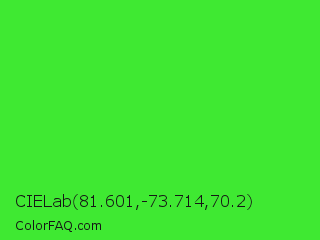 CIELab 81.601,-73.714,70.2 Color is a normal green color and the nearest color is Lime Green #32cd32. Hex code #3fe932 and RGB value is rgb(63,233,50). In RGB color space, this color is composed of 25% red, 91% green, 20% blue, In CMYK color space, this color is composed of 73% cyan, 0% magenta, 79% yellow , 9% black , In HSL color space, this color has a hue angle of 116° , 81% saturation and 55% lightness.