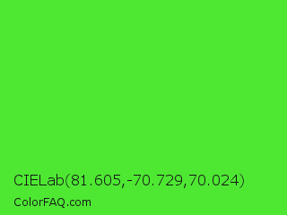 CIELab 81.605,-70.729,70.024 Color is a normal green color and the nearest color is Lime Green #32cd32. Hex code #4ee833 and RGB value is rgb(78,232,51). In RGB color space, this color is composed of 31% red, 91% green, 20% blue, In CMYK color space, this color is composed of 66% cyan, 0% magenta, 78% yellow , 9% black , In HSL color space, this color has a hue angle of 111° , 80% saturation and 55% lightness.