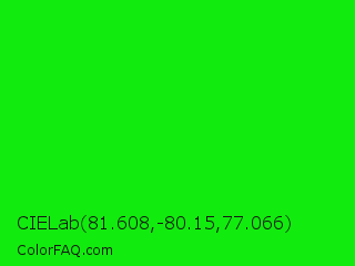 CIELab 81.608,-80.15,77.066 Color is a normal green color and the nearest color is Green #00ff00. Hex code #12eb0e and RGB value is rgb(18,235,14). In RGB color space, this color is composed of 7% red, 92% green, 5% blue, In CMYK color space, this color is composed of 92% cyan, 0% magenta, 94% yellow , 8% black , In HSL color space, this color has a hue angle of 119° , 89% saturation and 49% lightness.