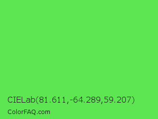 CIELab 81.611,-64.289,59.207 Color is a light green color and the nearest color is Screamin Green #66ff66. Hex code #5ee652 and RGB value is rgb(94,230,82). In RGB color space, this color is composed of 37% red, 90% green, 32% blue, In CMYK color space, this color is composed of 59% cyan, 0% magenta, 64% yellow , 10% black , In HSL color space, this color has a hue angle of 115° , 75% saturation and 61% lightness.
