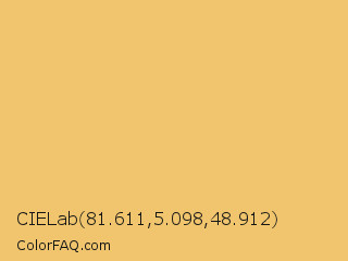 CIELab 81.611,5.098,48.912 Color is a light orange color and the nearest color is Rob Roy #eac674. Hex code #f0c56e and RGB value is rgb(240,197,110). In RGB color space, this color is composed of 94% red, 77% green, 43% blue, In CMYK color space, this color is composed of 0% cyan, 18% magenta, 54% yellow , 6% black , In HSL color space, this color has a hue angle of 40° , 81% saturation and 69% lightness.