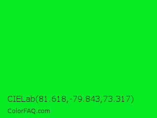 CIELab 81.618,-79.843,73.317 Color is a normal green color and the nearest color is Vivid Malachite #00cc33. Hex code #07eb25 and RGB value is rgb(7,235,37). In RGB color space, this color is composed of 3% red, 92% green, 15% blue, In CMYK color space, this color is composed of 97% cyan, 0% magenta, 84% yellow , 8% black , In HSL color space, this color has a hue angle of 128° , 94% saturation and 47% lightness.