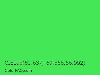 CIELab 81.637,-69.566,56.992 Color is a normal green color and the nearest color is UFO Green #3cd070. Hex code #44e857 and RGB value is rgb(68,232,87). In RGB color space, this color is composed of 27% red, 91% green, 34% blue, In CMYK color space, this color is composed of 71% cyan, 0% magenta, 63% yellow , 9% black , In HSL color space, this color has a hue angle of 127° , 78% saturation and 59% lightness.