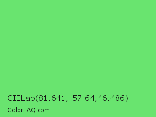 CIELab 81.641,-57.64,46.486 Color is a light green color and the nearest color is Pastel Green #77dd77. Hex code #69e46f and RGB value is rgb(105,228,111). In RGB color space, this color is composed of 41% red, 89% green, 44% blue, In CMYK color space, this color is composed of 54% cyan, 0% magenta, 51% yellow , 11% black , In HSL color space, this color has a hue angle of 123° , 69% saturation and 65% lightness.
