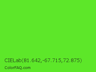 CIELab 81.642,-67.715,72.875 Color is a normal green color and the nearest color is Harlequin Green #46cb18. Hex code #5de729 and RGB value is rgb(93,231,41). In RGB color space, this color is composed of 36% red, 91% green, 16% blue, In CMYK color space, this color is composed of 60% cyan, 0% magenta, 82% yellow , 9% black , In HSL color space, this color has a hue angle of 104° , 80% saturation and 53% lightness.