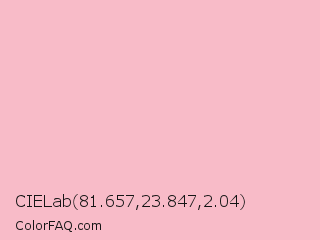 CIELab 81.657,23.847,2.04 Color is a very light red color and the nearest color is Orchid Pink #f2bdcd. Hex code #f8bbc8 and RGB value is rgb(248,187,200). In RGB color space, this color is composed of 97% red, 73% green, 78% blue, In CMYK color space, this color is composed of 0% cyan, 25% magenta, 19% yellow , 3% black , In HSL color space, this color has a hue angle of 347° , 81% saturation and 85% lightness.