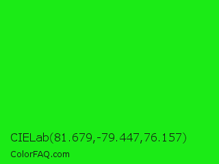 CIELab 81.679,-79.447,76.157 Color is a normal green color and the nearest color is Neon Green #39ff14. Hex code #1beb16 and RGB value is rgb(27,235,22). In RGB color space, this color is composed of 11% red, 92% green, 9% blue, In CMYK color space, this color is composed of 89% cyan, 0% magenta, 91% yellow , 8% black , In HSL color space, this color has a hue angle of 119° , 84% saturation and 50% lightness.