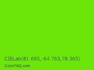 CIELab 81.695,-64.763,78.365 Color is a normal green color and the nearest color is Bright Green #66ff00. Hex code #6be608 and RGB value is rgb(107,230,8). In RGB color space, this color is composed of 42% red, 90% green, 3% blue, In CMYK color space, this color is composed of 53% cyan, 0% magenta, 97% yellow , 10% black , In HSL color space, this color has a hue angle of 93° , 93% saturation and 47% lightness.
