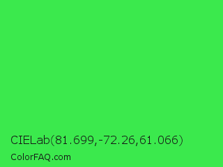 CIELab 81.699,-72.26,61.066 Color is a normal green color and the nearest color is Lime Green #32cd32. Hex code #3be94d and RGB value is rgb(59,233,77). In RGB color space, this color is composed of 23% red, 91% green, 30% blue, In CMYK color space, this color is composed of 75% cyan, 0% magenta, 67% yellow , 9% black , In HSL color space, this color has a hue angle of 126° , 80% saturation and 57% lightness.