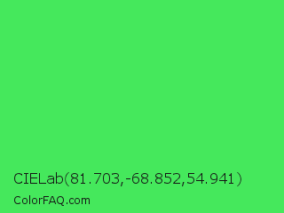CIELab 81.703,-68.852,54.941 Color is a normal green color and the nearest color is UFO Green #3cd070. Hex code #45e85c and RGB value is rgb(69,232,92). In RGB color space, this color is composed of 27% red, 91% green, 36% blue, In CMYK color space, this color is composed of 70% cyan, 0% magenta, 60% yellow , 9% black , In HSL color space, this color has a hue angle of 128° , 78% saturation and 59% lightness.