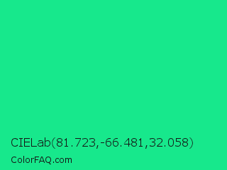 CIELab 81.723,-66.481,32.058 Color is a normal green color and the nearest color is Medium Spring Green #00fa9a. Hex code #17e88c and RGB value is rgb(23,232,140). In RGB color space, this color is composed of 9% red, 91% green, 55% blue, In CMYK color space, this color is composed of 90% cyan, 0% magenta, 40% yellow , 9% black , In HSL color space, this color has a hue angle of 154° , 82% saturation and 50% lightness.