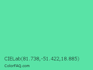 CIELab 81.738,-51.422,18.885 Color is a light green color and the nearest color is Medium Aquamarine #66ddaa. Hex code #59e3a6 and RGB value is rgb(89,227,166). In RGB color space, this color is composed of 35% red, 89% green, 65% blue, In CMYK color space, this color is composed of 61% cyan, 0% magenta, 27% yellow , 11% black , In HSL color space, this color has a hue angle of 153° , 71% saturation and 62% lightness.
