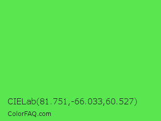 CIELab 81.751,-66.033,60.527 Color is a light green color and the nearest color is Screamin Green #66ff66. Hex code #59e74f and RGB value is rgb(89,231,79). In RGB color space, this color is composed of 35% red, 91% green, 31% blue, In CMYK color space, this color is composed of 61% cyan, 0% magenta, 66% yellow , 9% black , In HSL color space, this color has a hue angle of 116° , 76% saturation and 61% lightness.