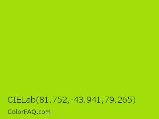 CIELab 81.752,-43.941,79.265 Color is a normal lime color and the nearest color is Vivid Lime Green #a6d608. Hex code #a1de0a and RGB value is rgb(161,222,10). In RGB color space, this color is composed of 63% red, 87% green, 4% blue, In CMYK color space, this color is composed of 27% cyan, 0% magenta, 95% yellow , 13% black , In HSL color space, this color has a hue angle of 77° , 91% saturation and 45% lightness.