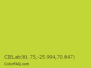 CIELab 81.75,-25.994,70.847 Color is a normal yellow color and the nearest color is Pear #d1e231. Hex code #c2d637 and RGB value is rgb(194,214,55). In RGB color space, this color is composed of 76% red, 84% green, 22% blue, In CMYK color space, this color is composed of 9% cyan, 0% magenta, 74% yellow , 16% black , In HSL color space, this color has a hue angle of 68° , 66% saturation and 53% lightness.