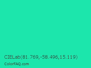 CIELab 81.769,-58.496,15.119 Color is a normal green color and the nearest color is Turquoise PWG #30d5c8. Hex code #1de6ad and RGB value is rgb(29,230,173). In RGB color space, this color is composed of 11% red, 90% green, 68% blue, In CMYK color space, this color is composed of 87% cyan, 0% magenta, 25% yellow , 10% black , In HSL color space, this color has a hue angle of 163° , 80% saturation and 51% lightness.