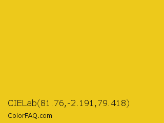 CIELab 81.76,-2.191,79.418 Color is a normal yellow color and the nearest color is Deep Lemon #f5c71a. Hex code #edc91b and RGB value is rgb(237,201,27). In RGB color space, this color is composed of 93% red, 79% green, 11% blue, In CMYK color space, this color is composed of 0% cyan, 15% magenta, 89% yellow , 7% black , In HSL color space, this color has a hue angle of 50° , 85% saturation and 52% lightness.