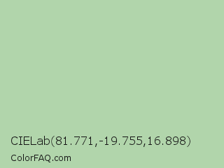 CIELab 81.771,-19.755,16.898 Color is a light green color and the nearest color is Moss Green #addfad. Hex code #b1d5ab and RGB value is rgb(177,213,171). In RGB color space, this color is composed of 69% red, 84% green, 67% blue, In CMYK color space, this color is composed of 17% cyan, 0% magenta, 20% yellow , 16% black , In HSL color space, this color has a hue angle of 111° , 33% saturation and 75% lightness.
