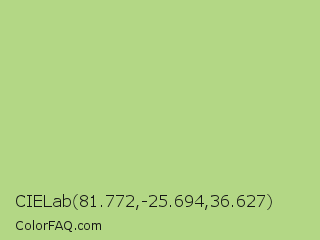 CIELab 81.772,-25.694,36.627 Color is a light green color and the nearest color is Feijoa #9fdd8c. Hex code #b3d785 and RGB value is rgb(179,215,133). In RGB color space, this color is composed of 70% red, 84% green, 52% blue, In CMYK color space, this color is composed of 17% cyan, 0% magenta, 38% yellow , 16% black , In HSL color space, this color has a hue angle of 86° , 51% saturation and 68% lightness.
