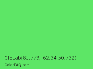 CIELab 81.773,-62.34,50.732 Color is a light green color and the nearest color is Screamin Green #66ff66. Hex code #5de666 and RGB value is rgb(93,230,102). In RGB color space, this color is composed of 36% red, 90% green, 40% blue, In CMYK color space, this color is composed of 60% cyan, 0% magenta, 56% yellow , 10% black , In HSL color space, this color has a hue angle of 124° , 73% saturation and 63% lightness.