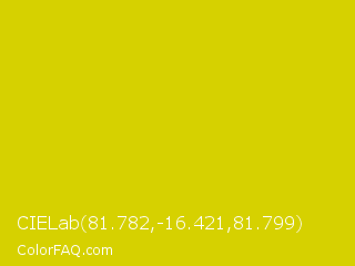 CIELab 81.782,-16.421,81.799 Color is a normal yellow color and the nearest color is Citrine #e4d00a. Hex code #d6d100 and RGB value is rgb(214,209,0). In RGB color space, this color is composed of 84% red, 82% green, 0% blue, In CMYK color space, this color is composed of 0% cyan, 2% magenta, 100% yellow , 16% black , In HSL color space, this color has a hue angle of 59° , 100% saturation and 42% lightness.