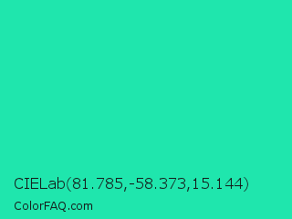 CIELab 81.785,-58.373,15.144 Color is a normal green color and the nearest color is Turquoise PWG #30d5c8. Hex code #1fe6ad and RGB value is rgb(31,230,173). In RGB color space, this color is composed of 12% red, 90% green, 68% blue, In CMYK color space, this color is composed of 87% cyan, 0% magenta, 25% yellow , 10% black , In HSL color space, this color has a hue angle of 163° , 80% saturation and 51% lightness.
